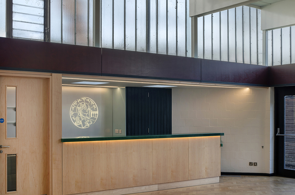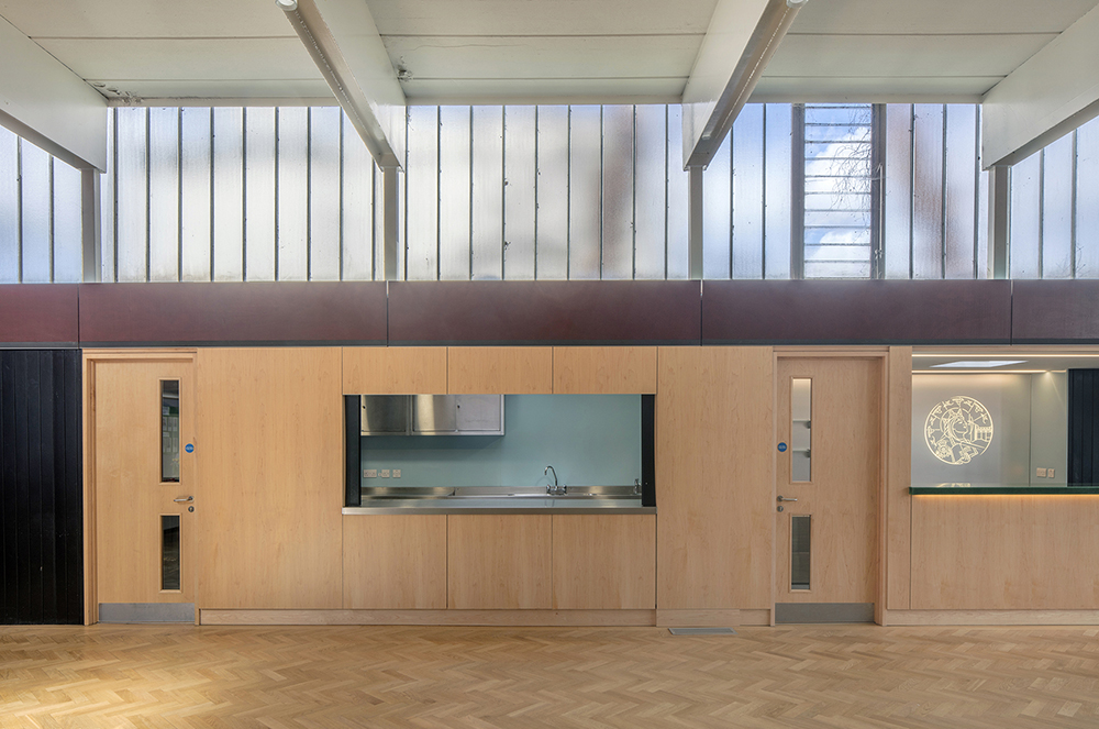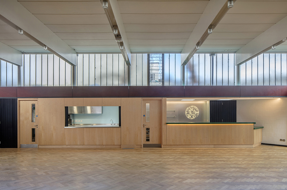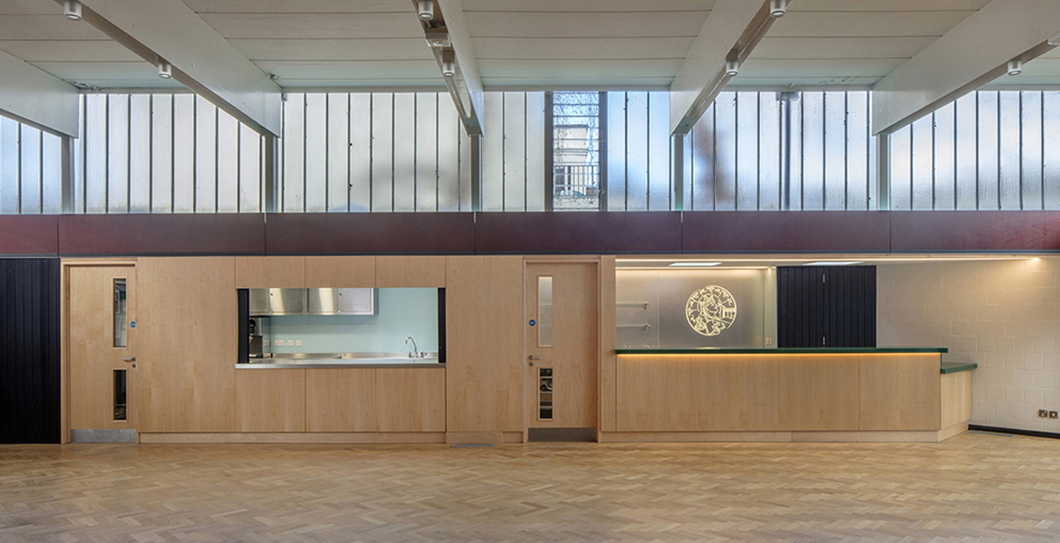 Church of St Margaret of Scotland, Twickenham: Refurbishment and remodelling of church social facilities, completed 2022. The Church of St Margaret is a Grade II Listed building dating from 1969. This scheme for refurbishment and remodelling secured the approval of the Historic Churches Commission. The social facilities including the Kitchen, Bar, WCs and Hall were greatly in need of refurbishment when we commenced Feasibility Studies in 2017, and the opening up of the Basement to serve as a parish meeting facility was added to the brief. The photos show the refurbished and remodelled Kitchen and Bar areas viewed from the Parish Hall.