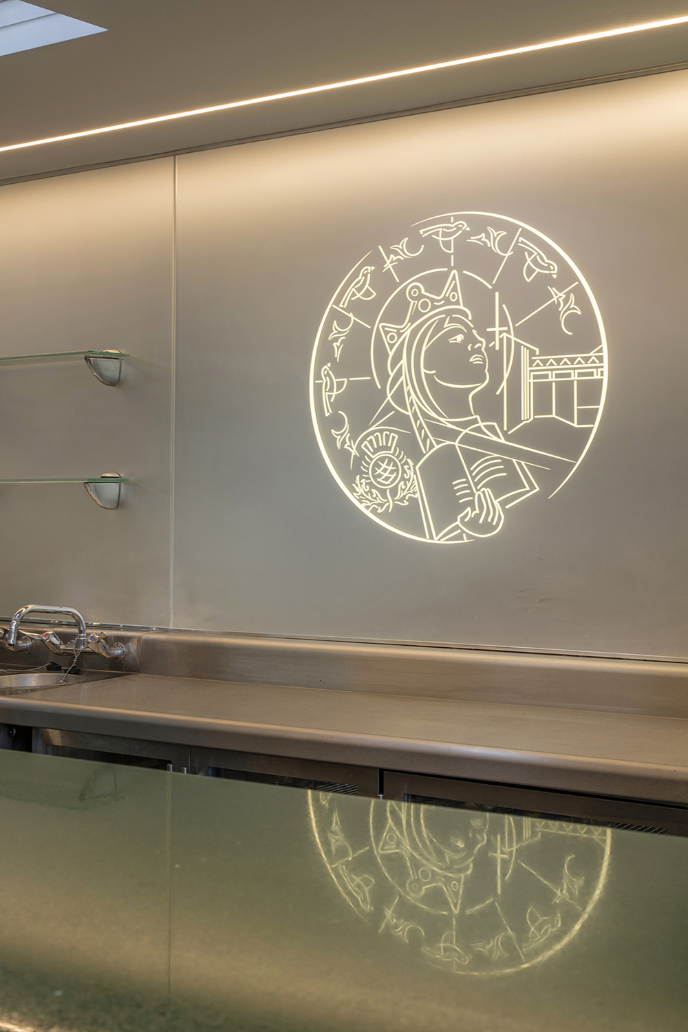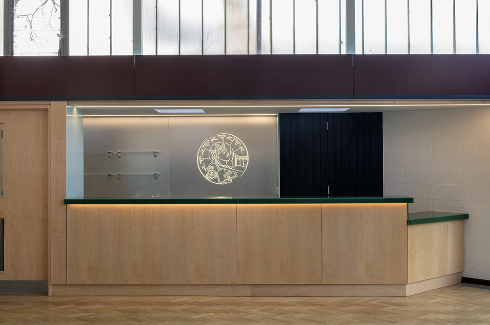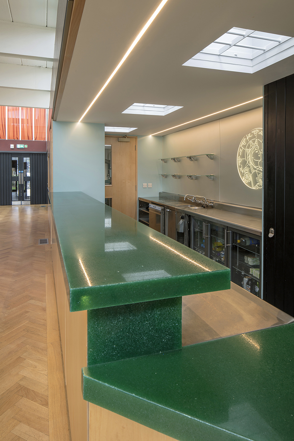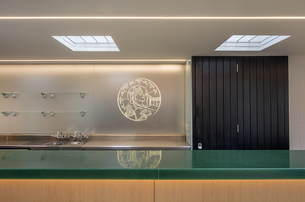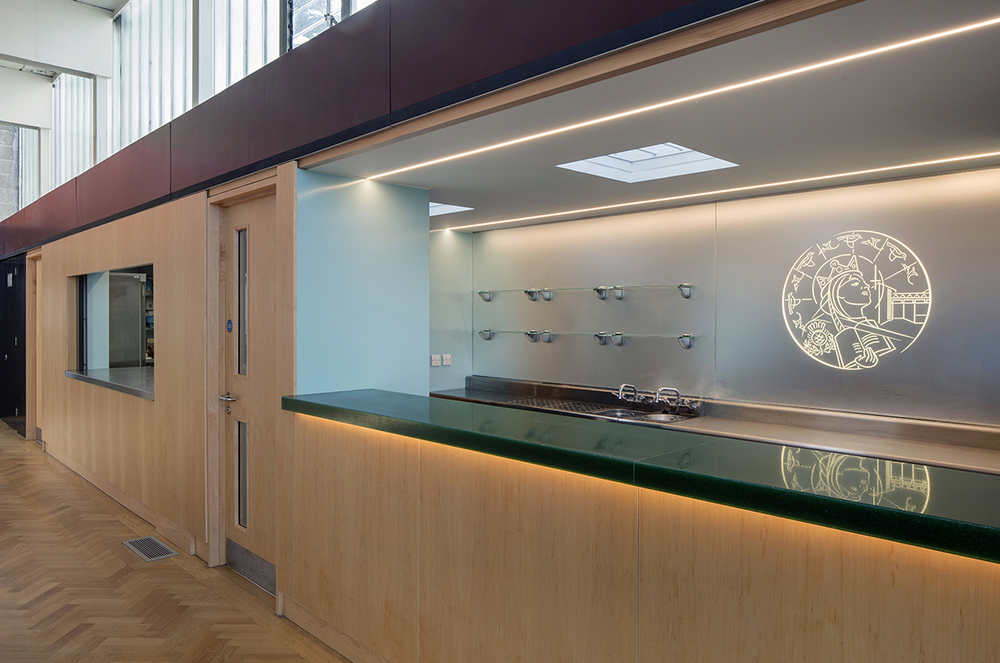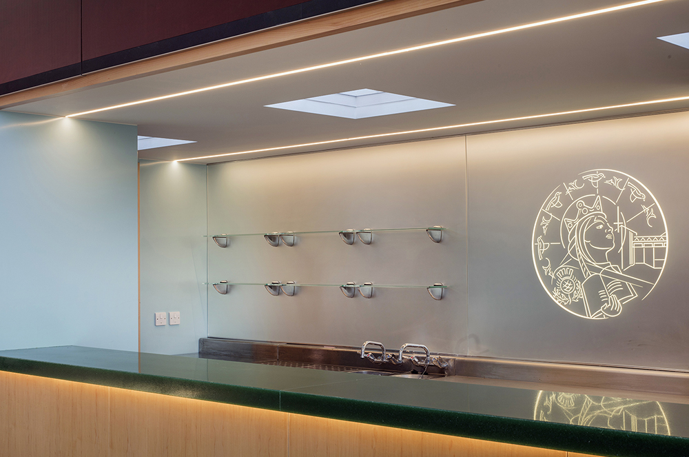 The Kitchen was enlarged and completely refitted to serve as a semi-commercial catering facility with new equipment including a commercial fast-cycle dishwasher, a mechanical extract system, and a fire-rated roller shutter linked to the new wireless fire alarm system installed throughout the scheme. The Bar area was stripped-out and refitted completely with new equipment including a fast-cycle commercial glasswasher and bottle cooler cabinets. New LED Lighting was installed throughout the scheme, and this included an LED Light sheet behind the specially commissioned artwork for the etched satin-mirrored roundel in the back bar area. The bespoke bar countertop was made of recycled glass. The Kitchen & Bar fronts and new doors were finished in Crown Cut Maple.