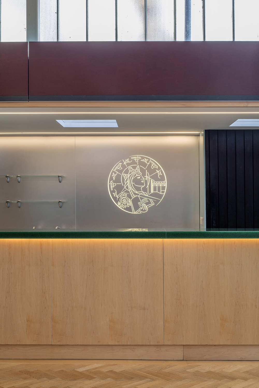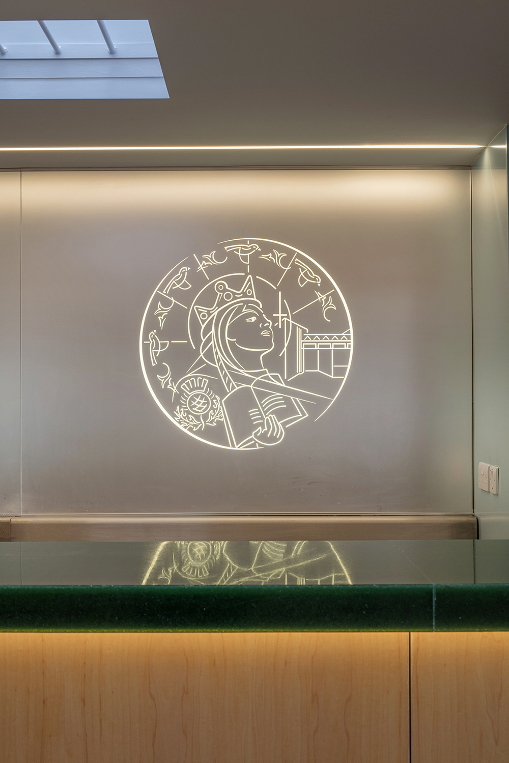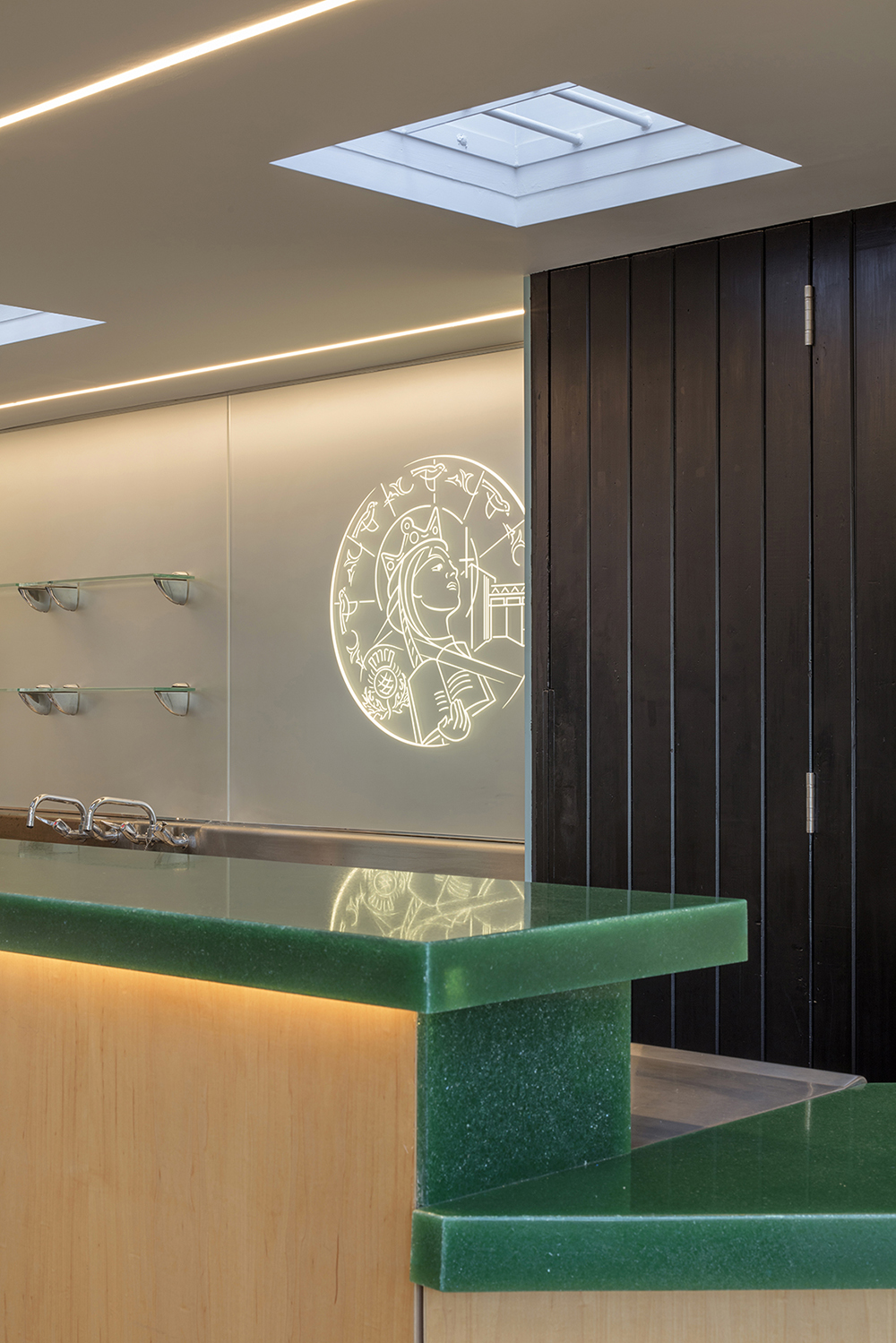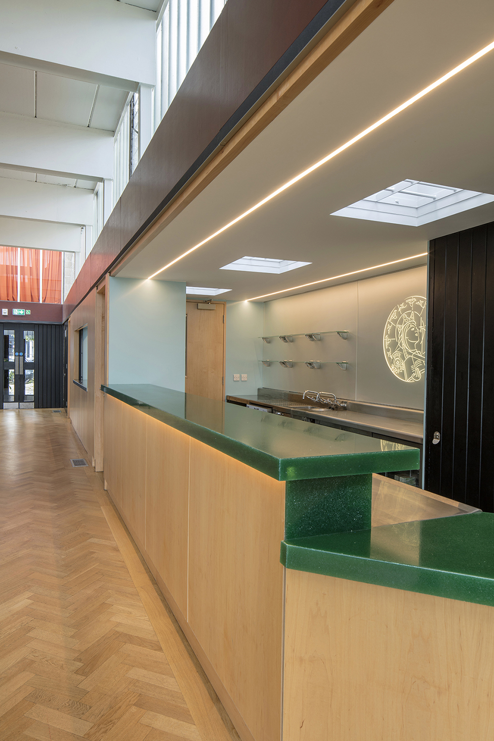 The Kitchen was enlarged and completely refitted to serve as a semi-commercial catering facility with new equipment including a commercial fast-cycle dishwasher, a mechanical extract system, and a fire-rated roller shutter linked to the new wireless fire alarm system installed throughout the scheme. The Bar area was stripped-out and refitted completely with new equipment including a fast-cycle commercial glasswasher and bottle cooler cabinets. New LED Lighting was installed throughout the scheme, and this included an LED Light sheet behind the specially commissioned artwork for the etched satin-mirrored roundel in the back bar area. The bespoke bar countertop was made of recycled glass. The Kitchen & Bar fronts and new doors were finished in Crown Cut Maple.